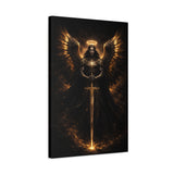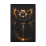 Wrapped in shadow and gold, the angel’s presence is commanding yet restrained. The dark wings and glowing halo create a striking contrast, symbolizing authority, finality, and transcendence beyond fear. The blade held firmly is not a weapon of chaos, but a symbol of order the passage from one realm to another.